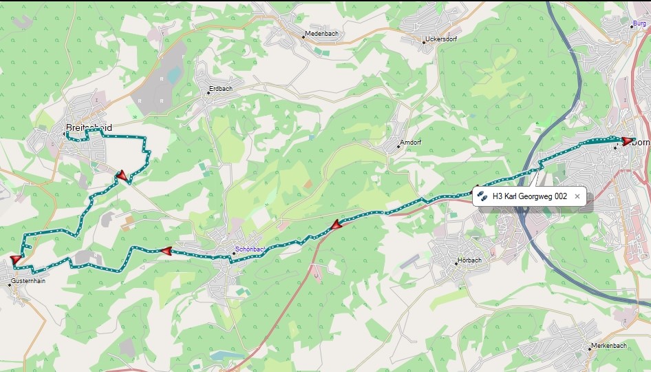 H 3 Karl-Georg-Weg ca. 14 km ca. 3,5 Std. ca. 443 m Wanderweg: Herborn Bhf., Kallenbachparkplatz, Gerichtsköppel, Waldschwimmbad, Alte Chaussee, Amdorfer Straße, Tiefholder, Schönbach, Tongruben, Gusternhain, Wanderwege-Wegweiser, (hier Pfad zum 200 m im Wald stehenden Wanderheim „ Herborner Haus“ des Westerwald-Vereins Herborn