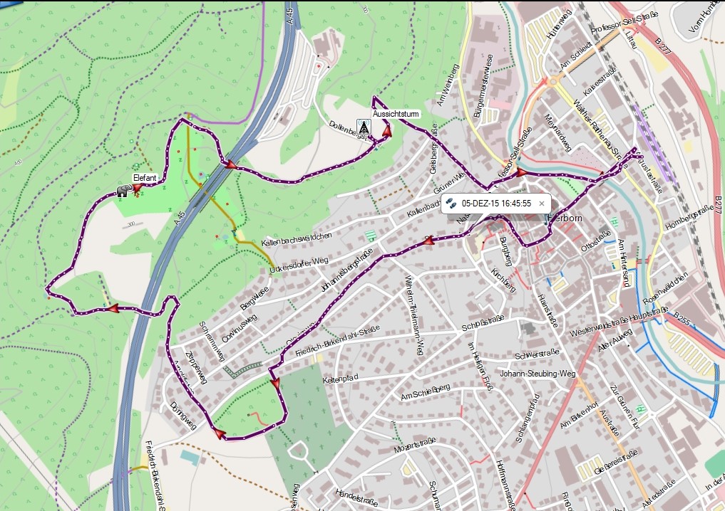 Herborn  Bahnhofstrasse, alter Friedhof, Obertorkreisel, Bürgermeisterwiese nach Burg, Elkersberg, Rastplatz-Hustebachtal, Monzenbachtal, Grube Falkenstein, Oberscheld, Scheldetal, Niederscheld-Bahnhof. Man kann von hier mit der Markierung D (schwarzes D auf weißem Feld) in ca. 2 Std. nach Herborn zurückwandern.